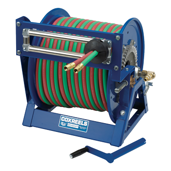 1275W Series hand crank or motorized "Welding" hose reels are built to manage long lengths of bulky twin line welding hose. The direct bevel gear drive, low profile outlet riser and open drum slot design are features greatly appreciated by the regular user. Dual brass swivel inlets on each side of the reel assure full flow trouble free performance.