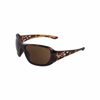Fashionable tortoise shell safety glasses for women with Rhinestone design on temples. 8 base curve, dual smoke lenses. 99% UV protection. Meets ANSI Z87.1 - Impact requirements.
