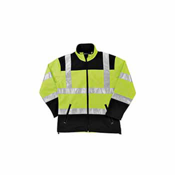 Women's Class 2 polyester bonded with fleece. 2 ext pockets with waterproof zipper. Full length storm inner flap. Jacket is water resistant. Adjustable sweep (drawstring) and sleeve cuffs. Black bottom. Conforms to ANSI 107 standard
