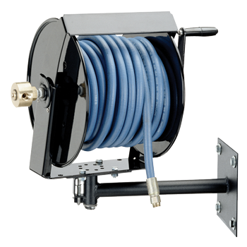 SM Series "Swivel Mount" hand crank hose reels swivel on demand in the direction your work takes you and locks in eight different positions as desired. Like the 100 Series, the SM Series is lightweight, compact and versatile with a working pressure up to 4,000 PSI. The "U" shaped base and hose control bar together add strength and rigidity while keeping the hose from slipping off the side discs. Add the SMK-202 wall mount bracket for swiveling mounted positions.