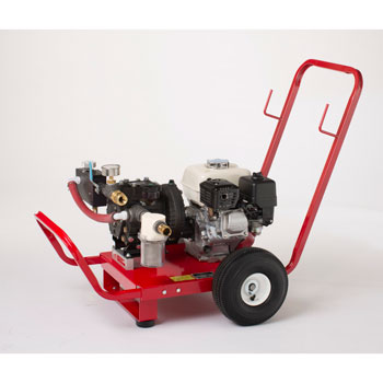 Diaphragm Pump With 5.5 HP Honda Engine. Diaphram pump that can handle up to 10 percent chlorine solution. The pump can be preset to test lines from up to 300 PSI. Pumps 15 gallons of water per minute. Comes standard with a cart and 5.5 HP, 4-cycle Honda engine. Briggs & Stratton engine and roll cage available.