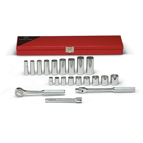 Wright 337 3/8 Drive 21 Piece 6 Point Standard & Deep Socket Set 3/8" - 7/8" with ratchet, flex handle, 6" extension, and tool box. Equivalent to Allen 19128, Armstrong 15-330, Proto J5002B
